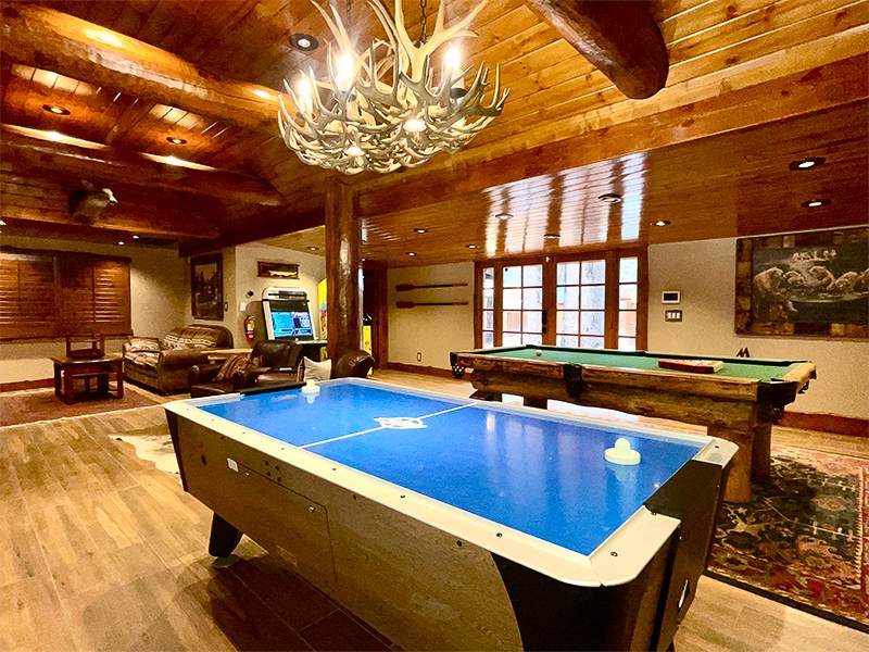 Set on a fenced acre with nearly 100 towering Jeffrey Pines, this pet-friendly oasis offers a variety of outdoor activities. Kids and adults alike have a playground of amenities to choose from: volleyball, basketball, a spa with TV viewing, hammocks, horseshoes, mini golf, bean bag toss, tetherball, or uncork a bottle of wine & break out our S'mores kit and gather around our massive fire pit! If indoorsy is more your vibe, step into our newly remodeled game room. Inside you'll find air hockey, a pool table, two arcade games, a gaming area, board games, a mini kids' foosball table, and 3 TV's for the ultimate entertainment experience!